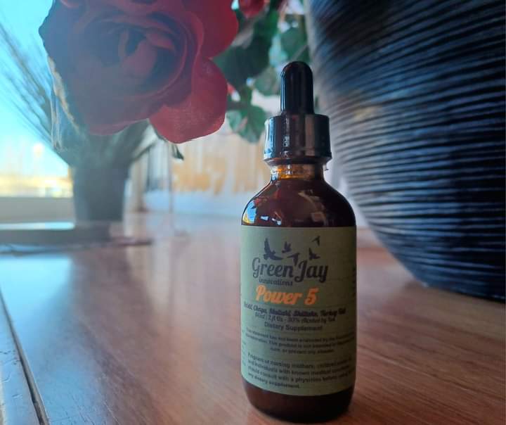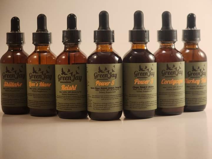 One of our best selling tinctures, our dual-extracted Power 5. Potent and full containing Turkey Tail, Reishi, Chaga, Hen-of-the-wood, and Shiitake! Get yours at: https://greenjayinnovations.square.site/