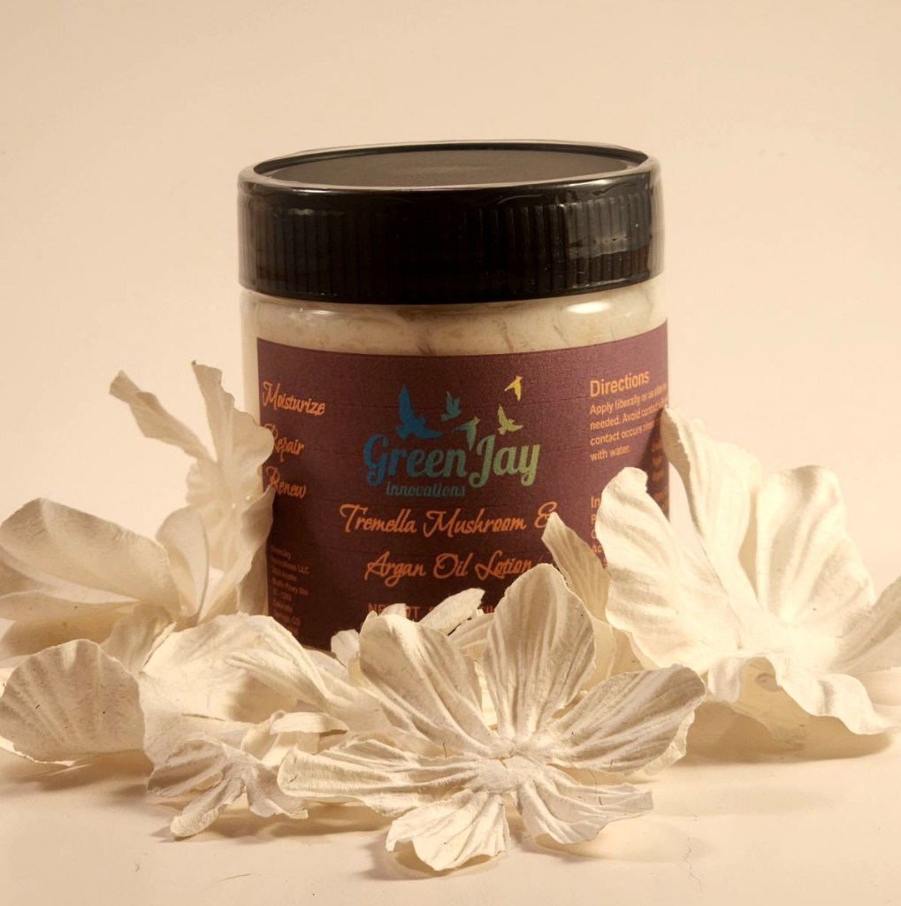 Our Tremella mushroom & Moroccan Argan Oil lotion is your skins best friend! Tremella, also known as the Snow Mushroom, has had many studies done on it for its skin protecting, repairing and rejuvenating qualities. Reported to have strong anti-aging qualities as well as helping the skin heal faster, this mushroom is unmatched for skin health! Get yours at: https://greenjayinnovations.square.site/